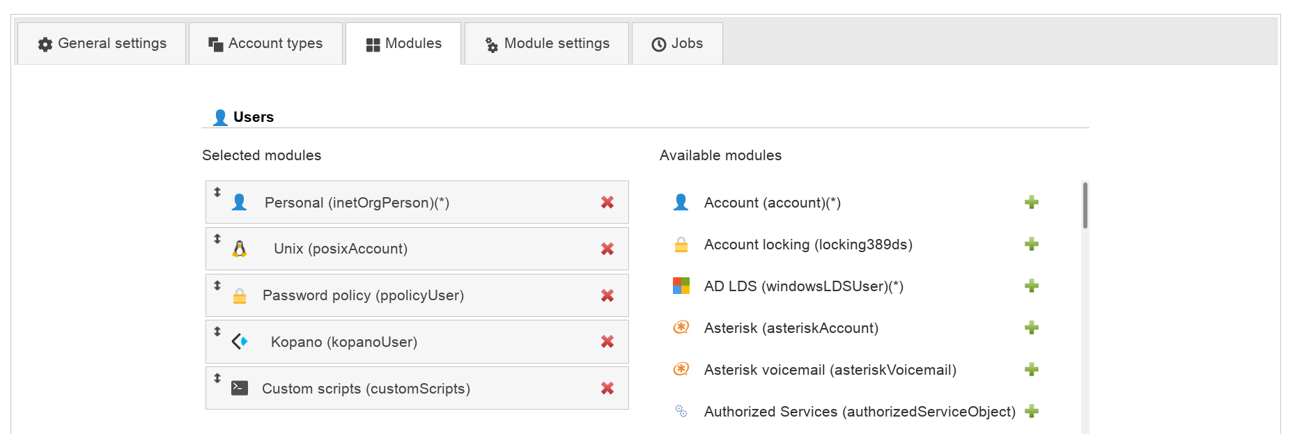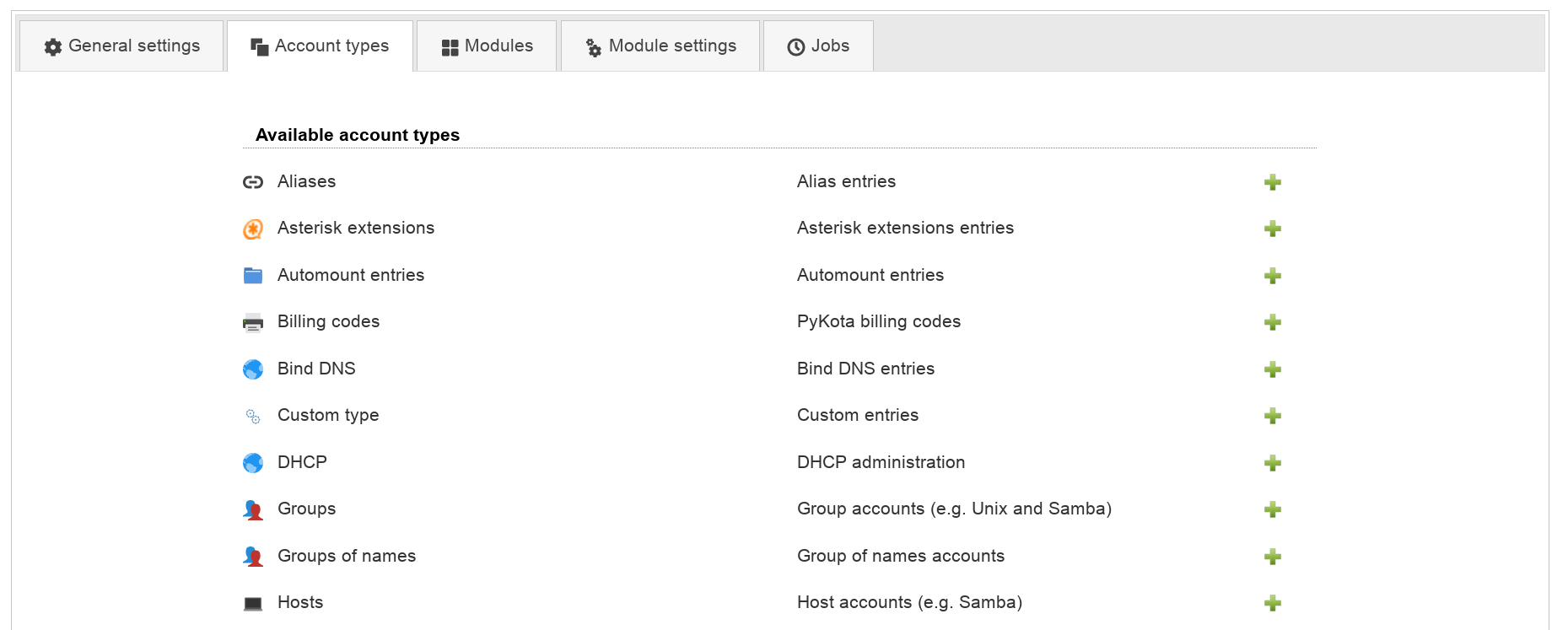 Modules: list of modules which define what account aspects (e.g. Unix, Samba, Kolab) you would like to manage