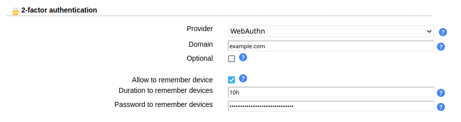 Domain: Please enter the WebAuthn domain. This is the public domain of the web server (e.g. "example.com"). Do not include protocol or port. Browsers will reject authentication if the domain does not match the web server domain.