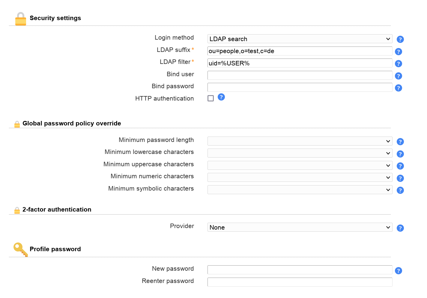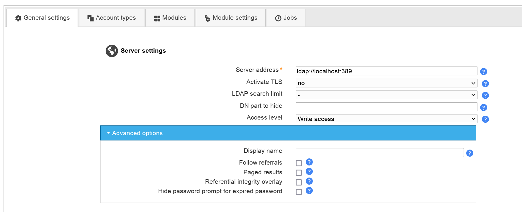 General settings: general settings about your LDAP server (e.g. host name and security settings)