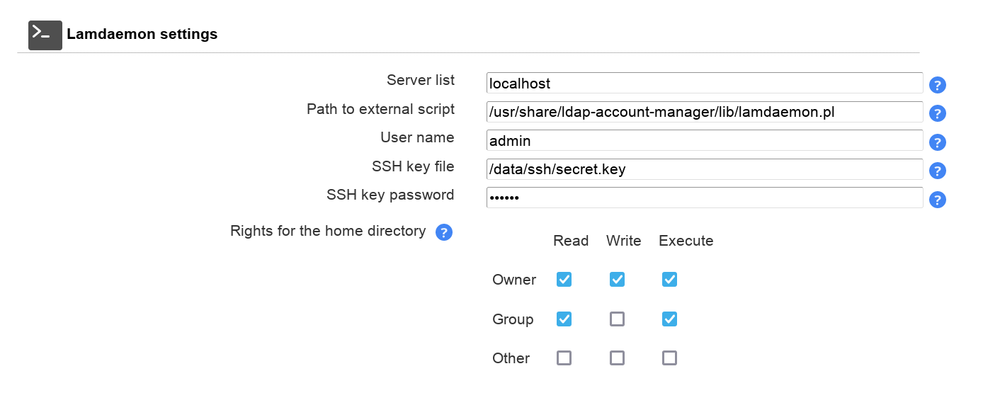 LAM can manage user home directories and quotas with an external script. You can specify the home directory server and where the script is located. The default rights for new home directories can be set, too.
