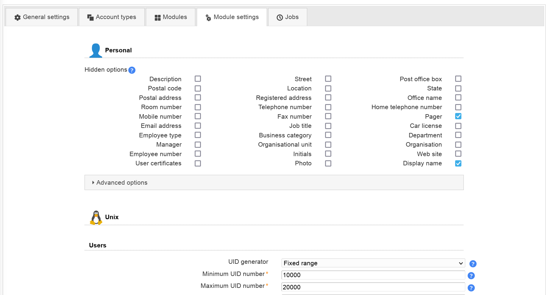 Furthermore, there may be any number of additional active account modules. E.g. you may select "Personal" as base module and Unix + Samba as additional modules.