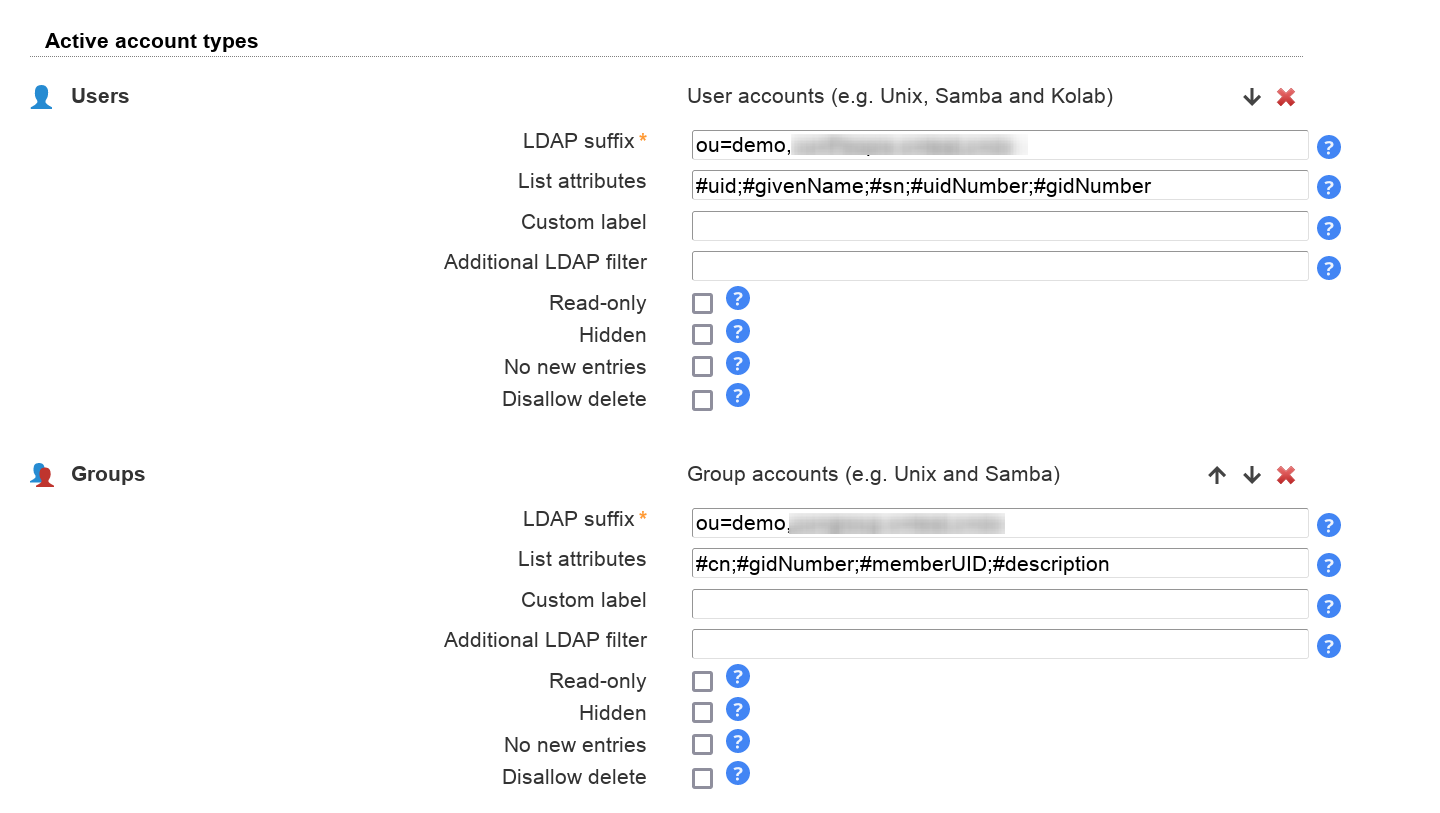 Account types: list of account types (e.g. users and groups) that you would like to manage and type specific settings (e.g. LDAP suffix)