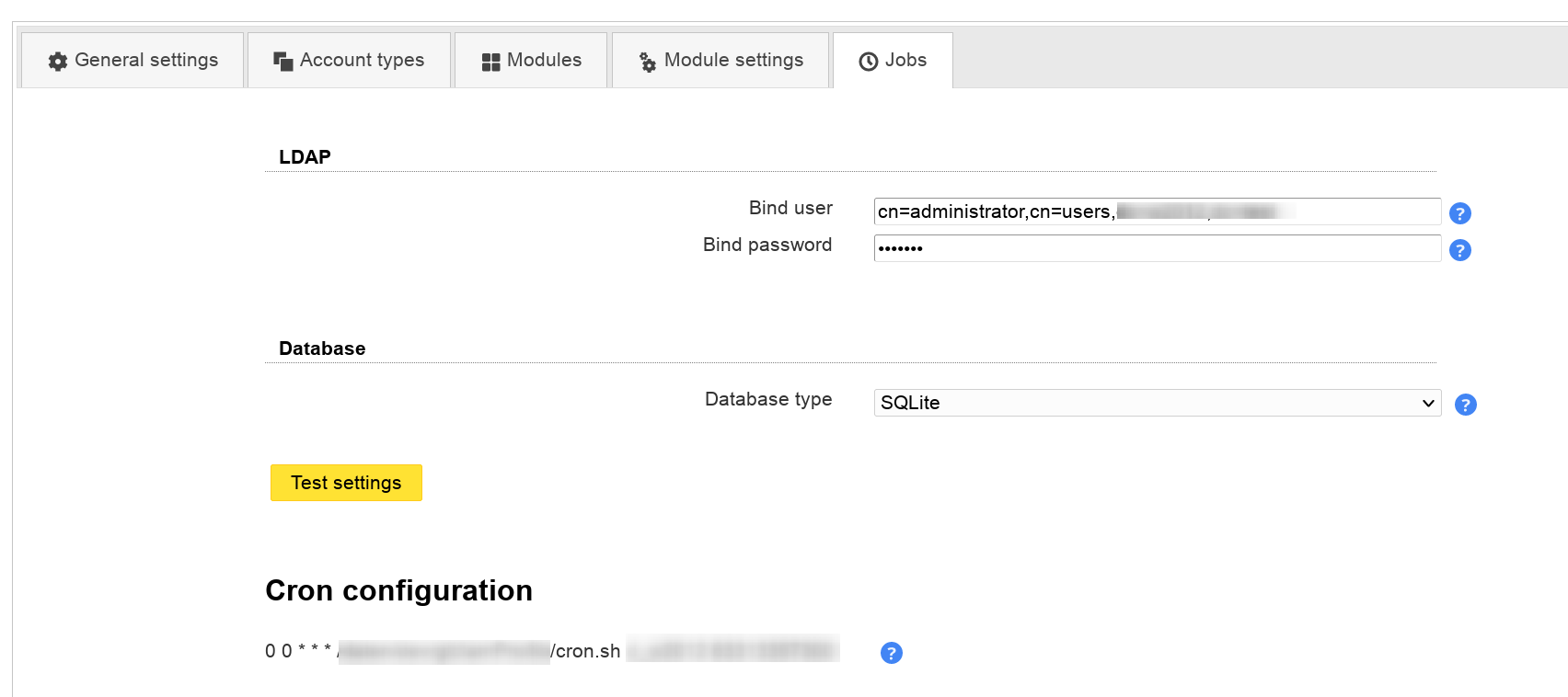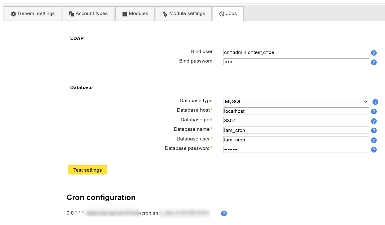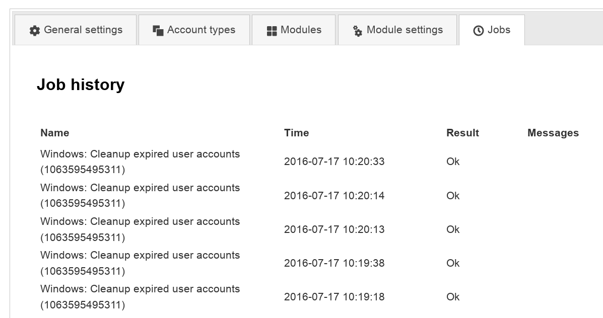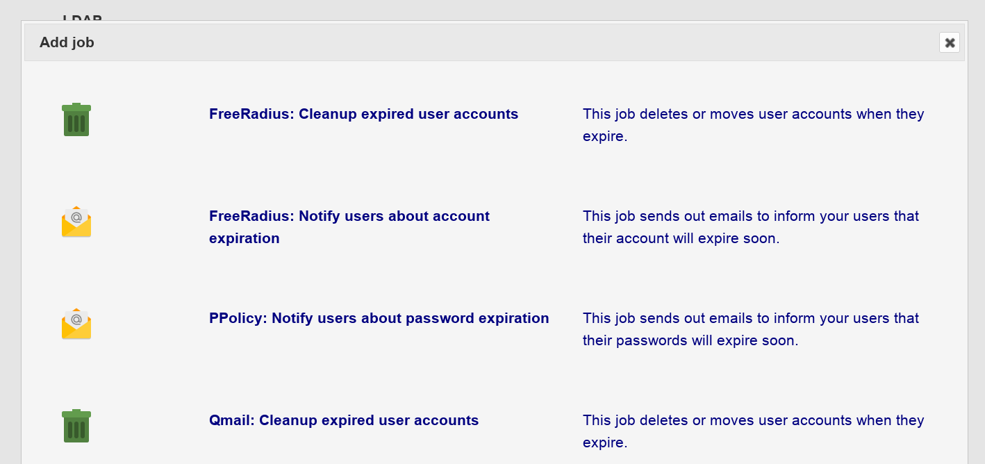 To add a new job just click on the "Add job" button and select the job type you need. The list of available jobs depends on your active account modules. E.g. the PPolicy job will only be available if you activated PPolicy user module.