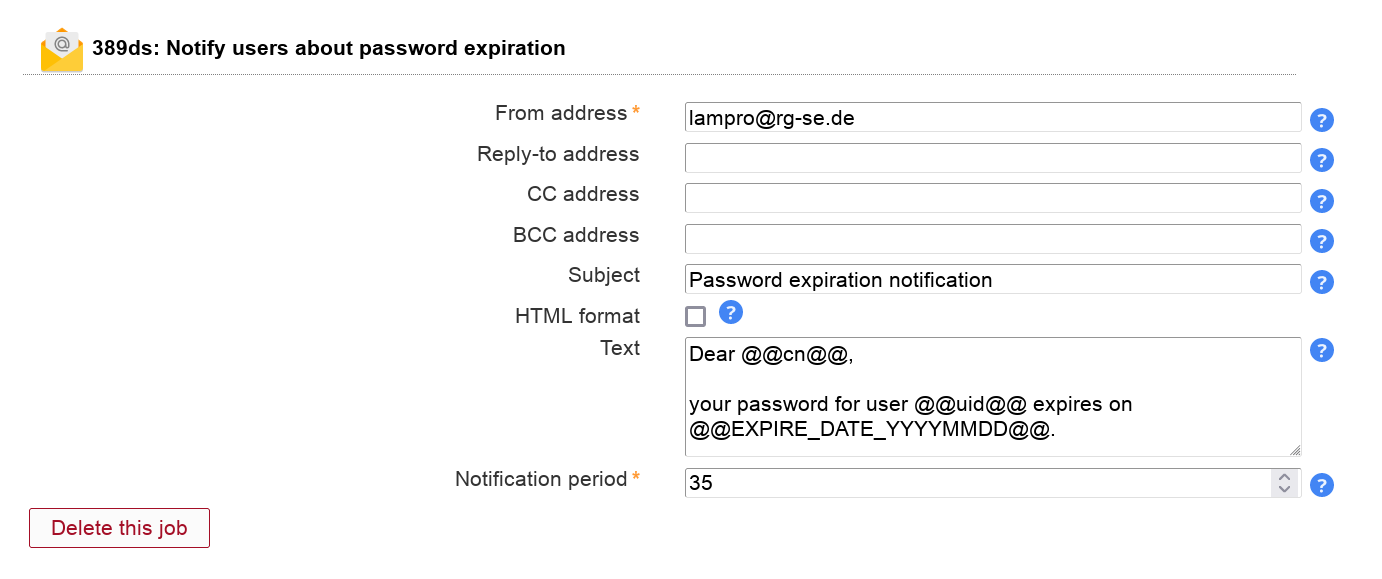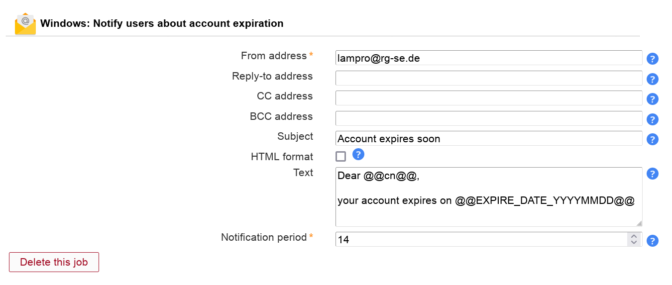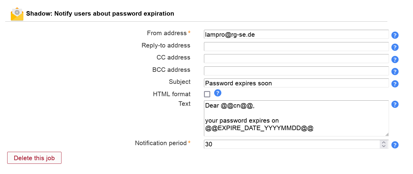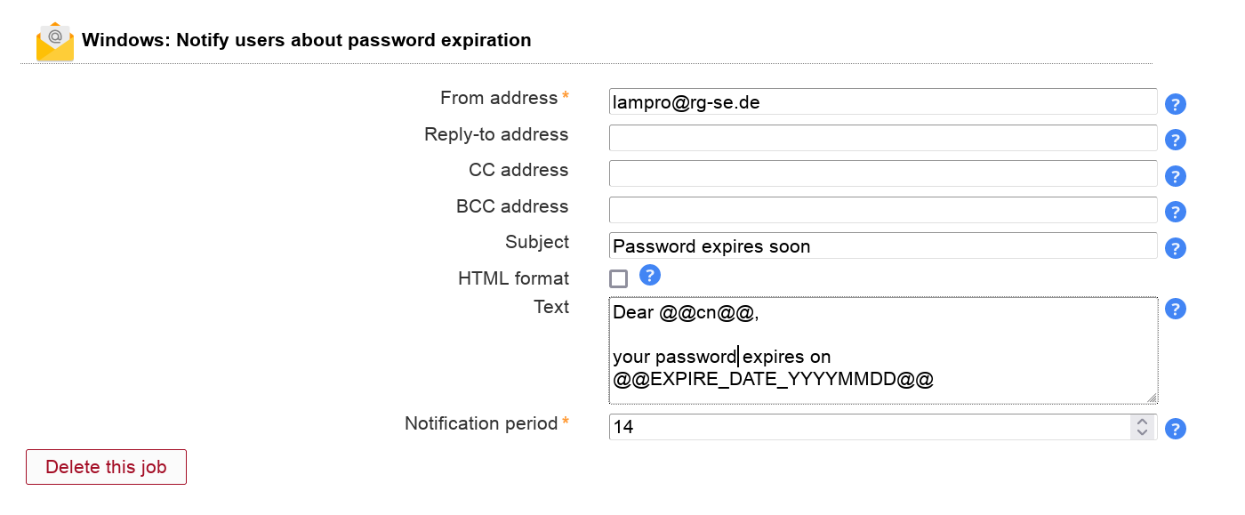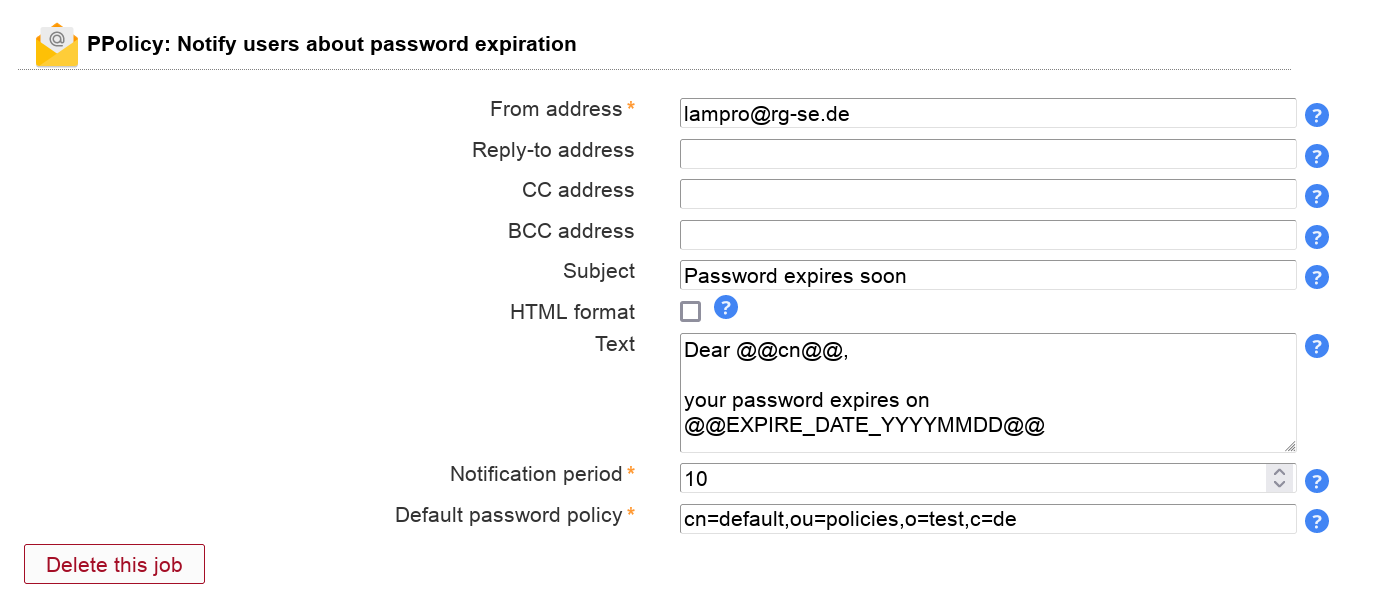 Warning time (pwdExpireWarning) = 14 days, notification period = 0: LAM will send out the email 14 days before the password expires