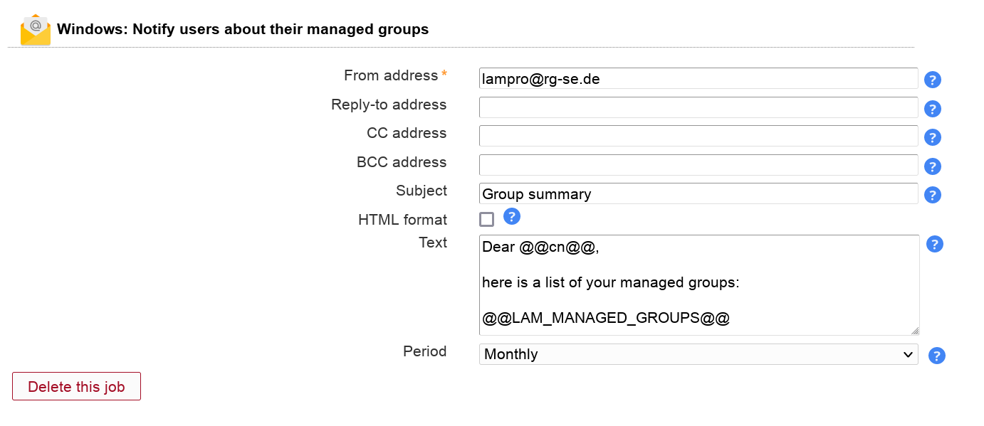 This will send your users an email with the groups they manage. This also includes a list of users in these groups. The users and groups are searched using the user+group account types that are specified in server profile.