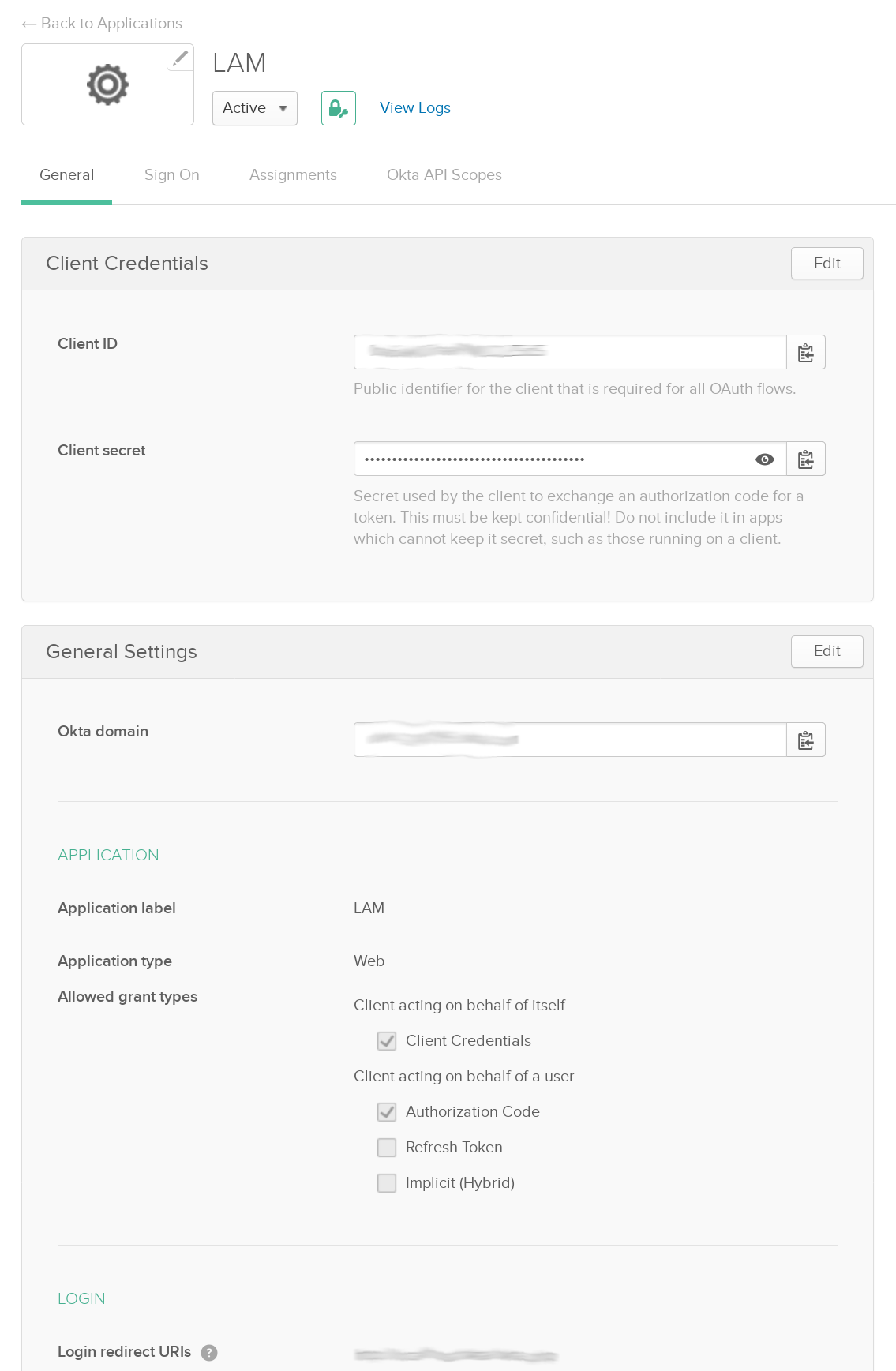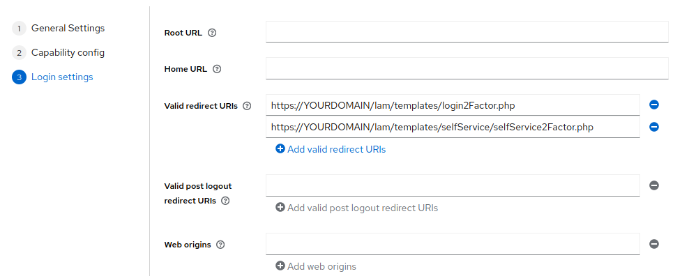There, you will need to configure LAM's 2-factor URLs as "Login redirect URIs" in the new application. They are "https://YOURDOMAIN/lam/templates/login2Factor.php" for admin interface and "https://YOURDOMAIN/lam/templates/selfService/selfService2Factor.php" for self service. You will get an error message during login with the URL to configure in case it was wrong.