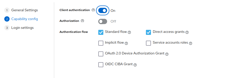 Now enable "Client authentication" and enter the valid redirect URLs in the last step.