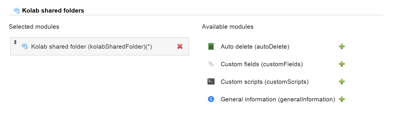 Then add the "Kolab shared folder" module on tab "Modules".