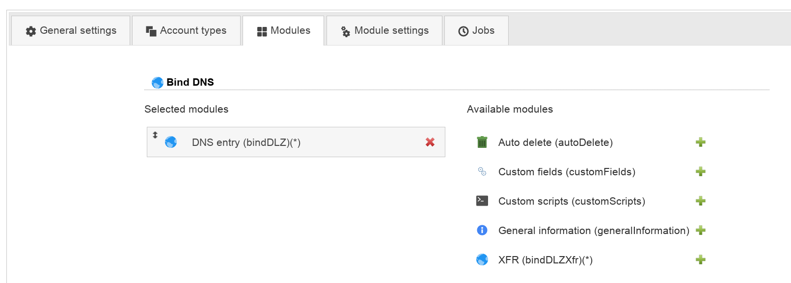 First, you need to add the Bind DNS account type and the Bind DLZ module: