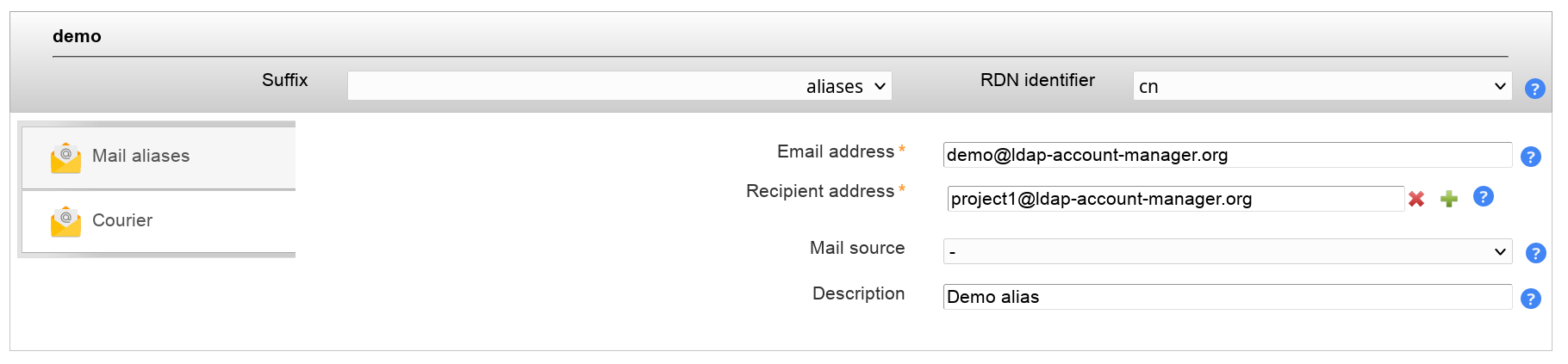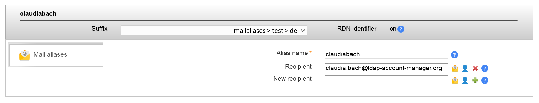 The mail aliases will then appear as separate tab inside LAM. You may then manage the aliases with their names and recipient addresses.