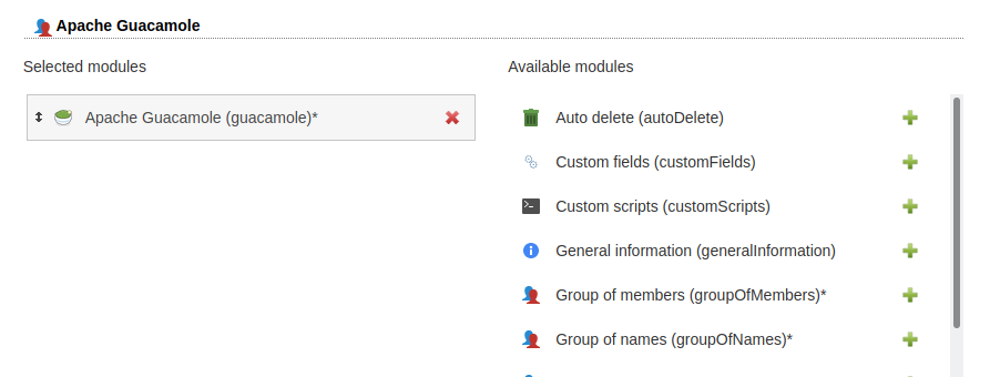 Then add the Guacamole module on tab "Modules".