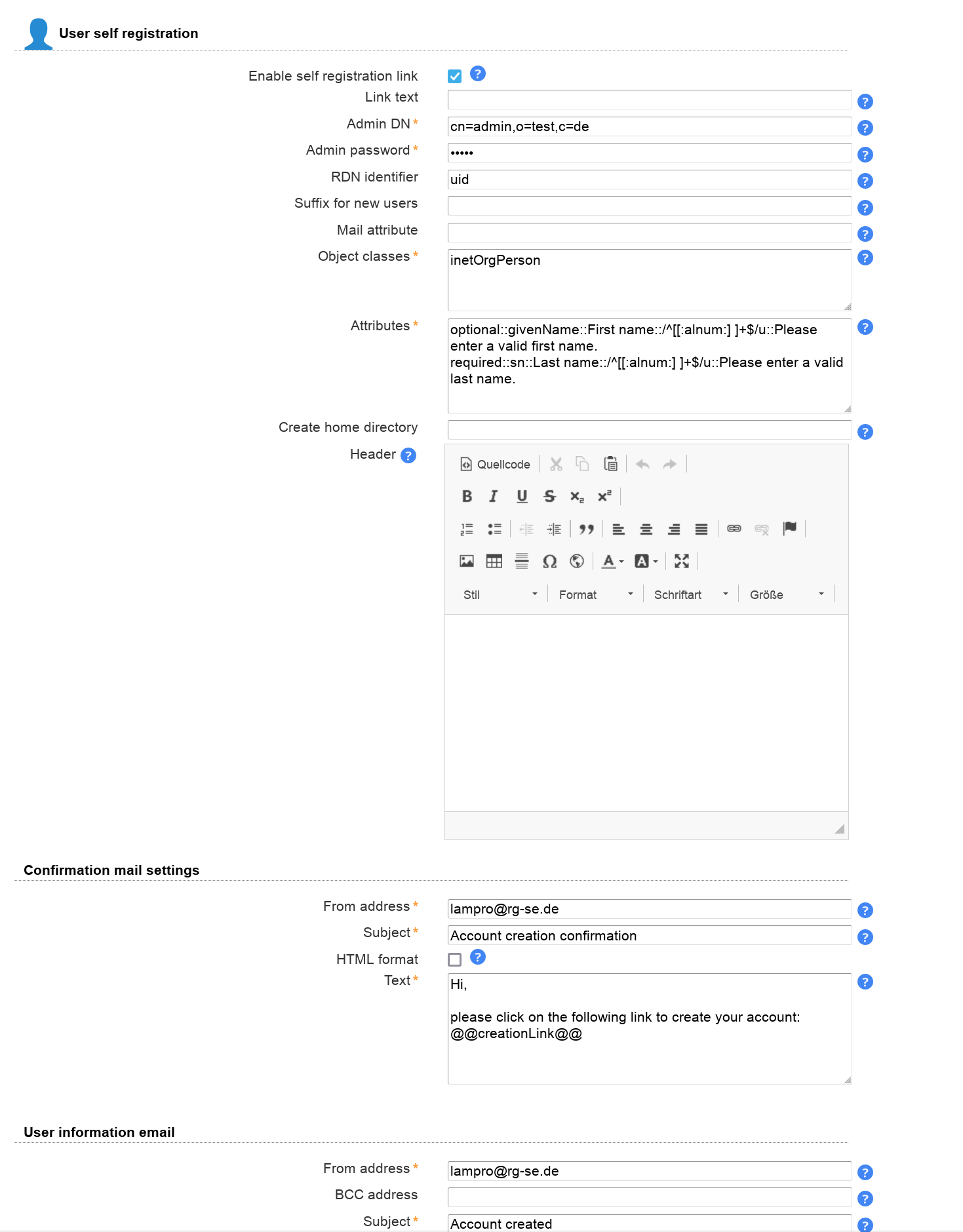 | Base URL | Please enter the base URL of your webserver (e.g. https://www.example.com). This is used to generate links in emails for password self reset and user self registration. |