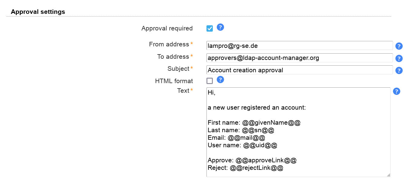 | Main page footer | This text is displayed as footer on the self service main page where your users change their data. |