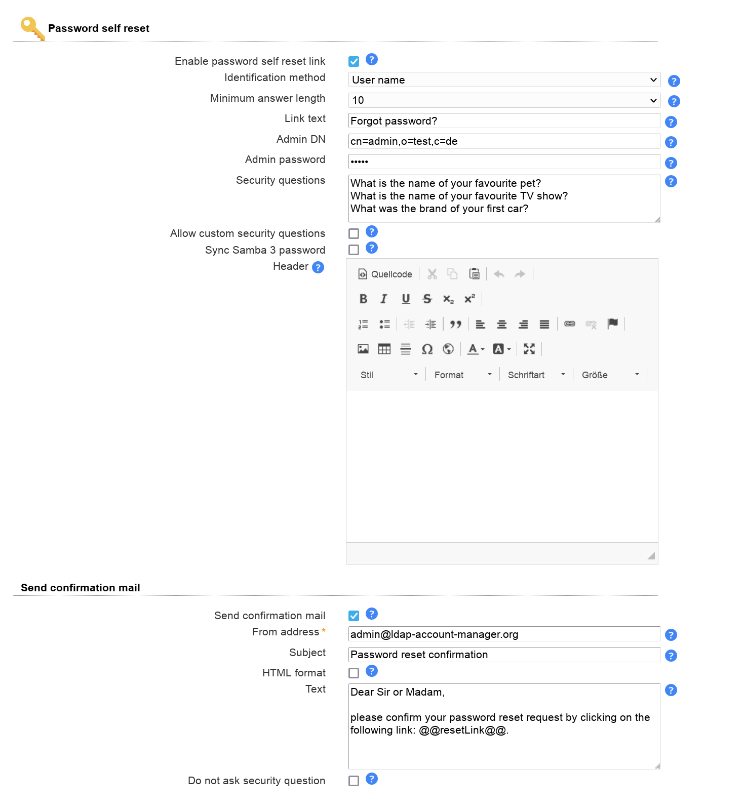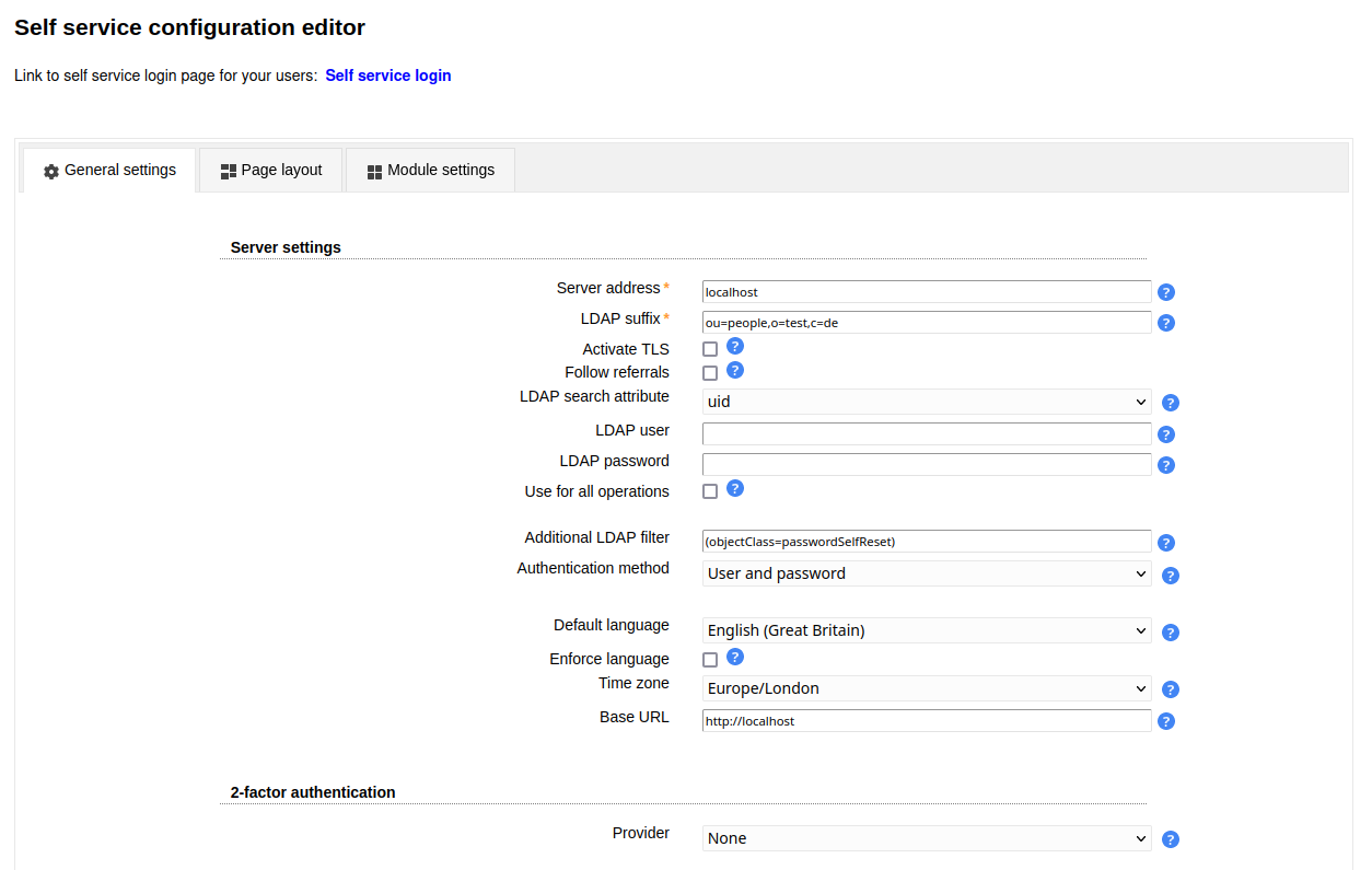 | Additional LDAP filter | Use this to enter an additional LDAP filter (e.g. "(objectClass=passwordSelfReset)") to reduce the number of accounts who may use self service. |