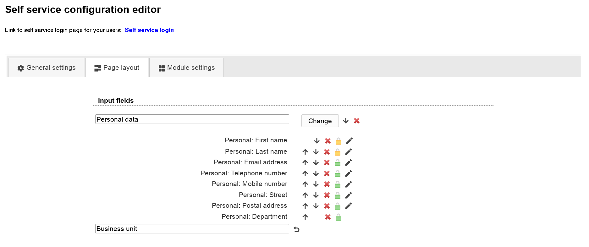 You may also set some fields as read-only for your users. This can be done by clicking on the lock symbol. Read-only fields can be used to show your users additional data on the self service page that must not be changed by themselves (e.g. first/last name).