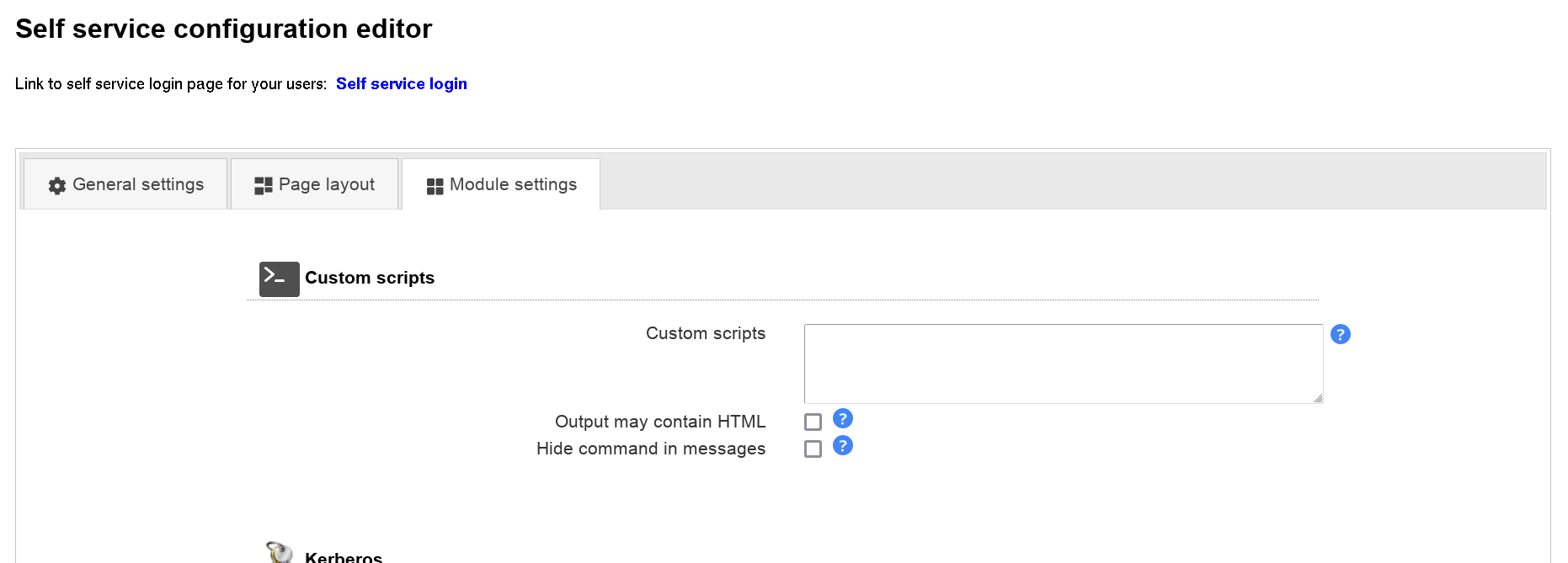 | Page header | This HTML code will be placed on top of all self service pages. E.g. you can use this to place your custom logo. Any HTML code is permitted. |