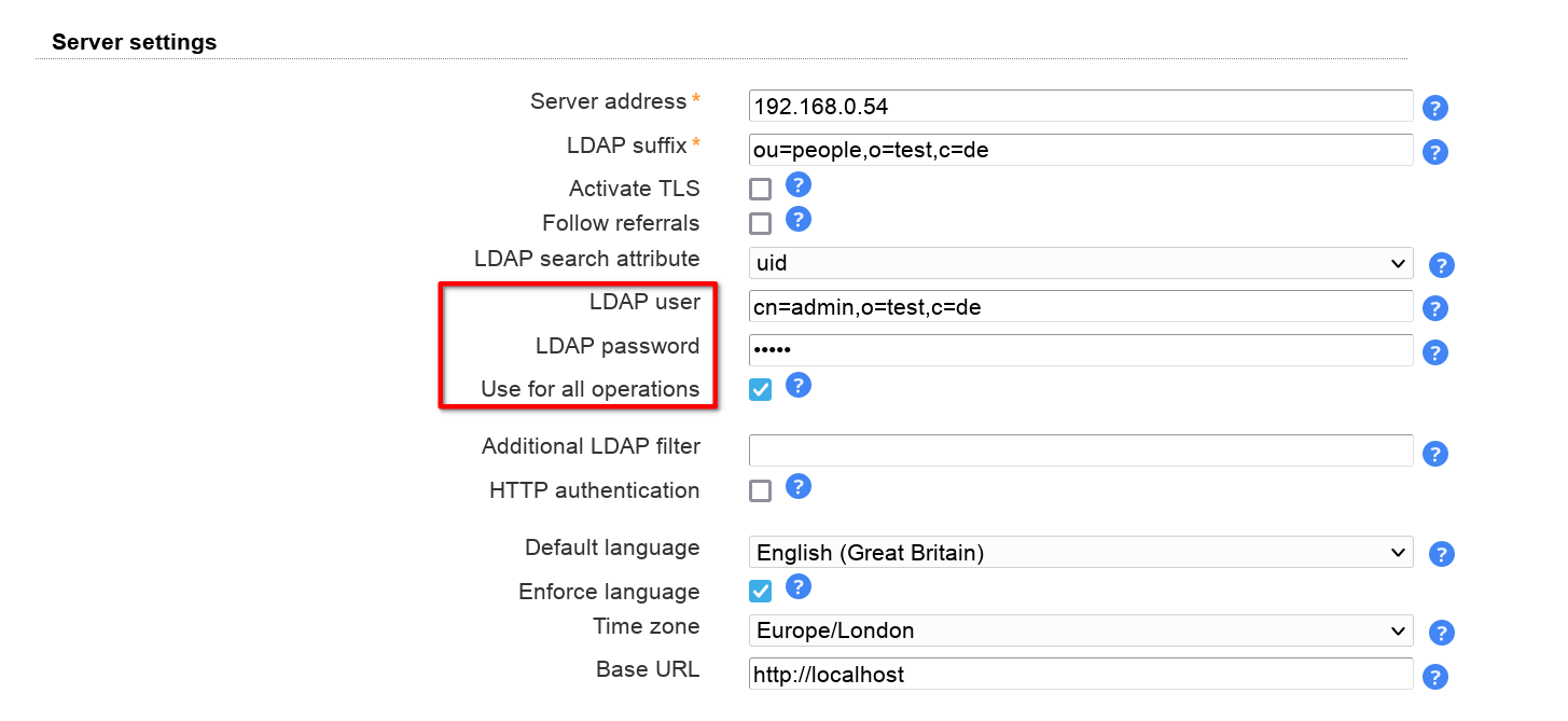 | Server address | The address of your LDAP server. For LDAP+SSL use "ldaps://myserver" |