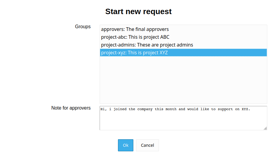 The user sees a button to open the new request dialog. Here the groups can be selected and an optional note can be provided.